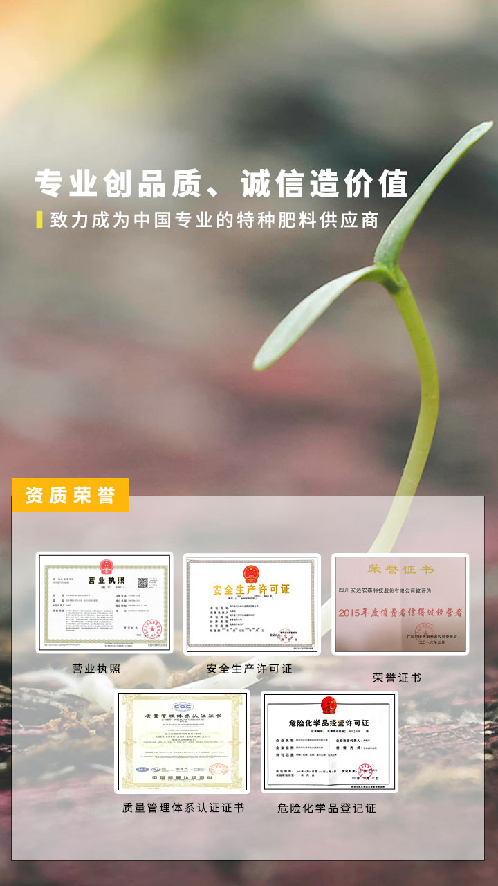 經(jīng)過二十余年的探索和實(shí)踐,依托自身技術(shù)和出口背景,按照國際市場(chǎng)規(guī)范培養(yǎng)了大批高素質(zhì)的專業(yè)化技術(shù)化團(tuán)隊(duì),掌握了水溶性肥料的核心技術(shù),擁有完善的研發(fā)中心、質(zhì)檢中心,目前已獲得多個(gè)國家專利技術(shù)。公司一直把“做中國專業(yè)的特種肥料供應(yīng)商”作為自身的發(fā)展使命。推廣高端植物營養(yǎng)與先進(jìn)技術(shù),高效施肥方式的綜合配套方案,減輕中國種植業(yè)勞動(dòng)強(qiáng)度,讓種植業(yè)效率更高、效果更強(qiáng)、效益更好!努力成為革新中國種植業(yè)生產(chǎn)方式的偉大公司!